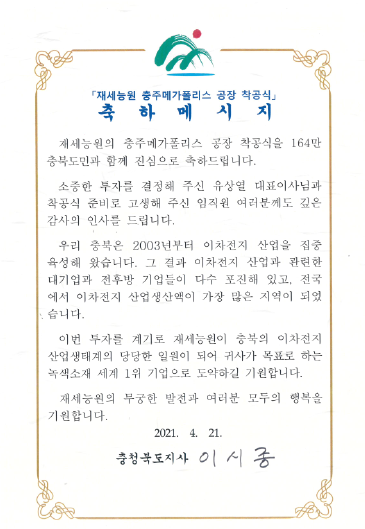 韓國(guó)忠清北道省長(zhǎng)發(fā)來(lái)賀詞:“忠清北道是韓國(guó)鋰電池生產(chǎn)總額最高的地區(qū),感謝容百選擇加入!衷心期待容百成為綠色材料的全球領(lǐng)先企業(yè)。”